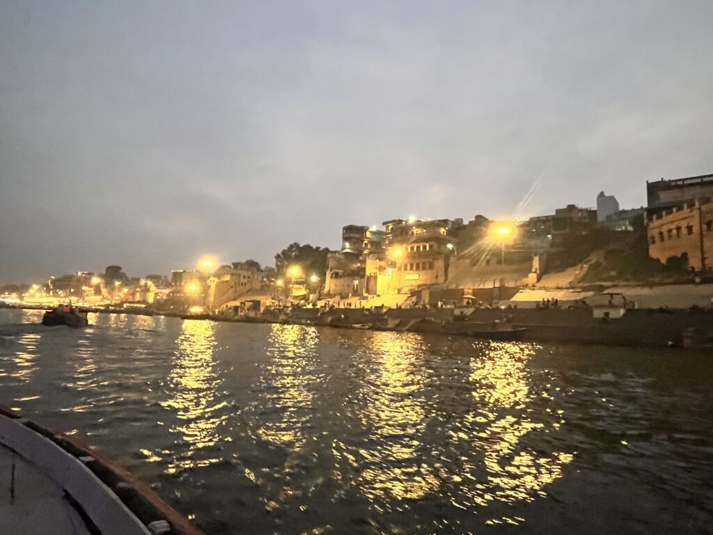 ボートから見る川岸。夕方になるとライトアップされてキレイ!近くにはごうごうと炎を焚く火葬場が。(興味なかったので行かなかった)
